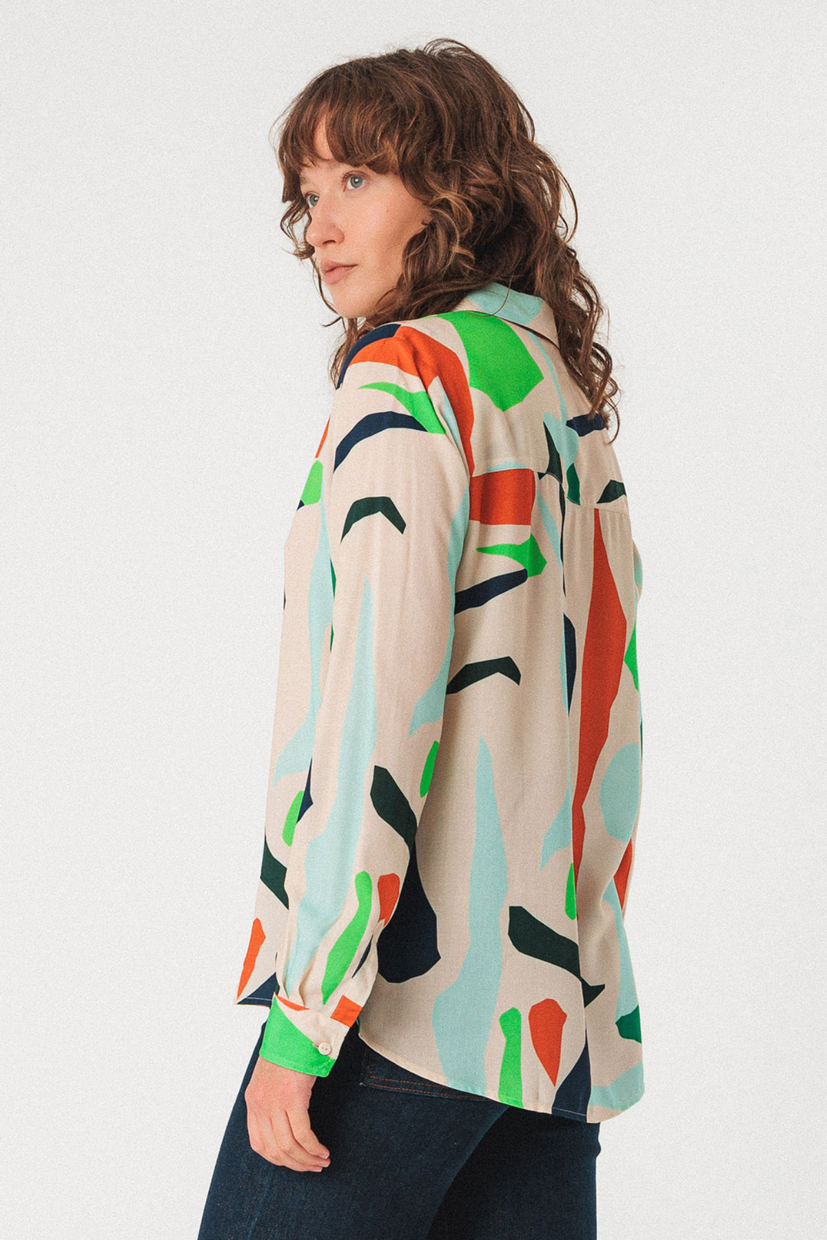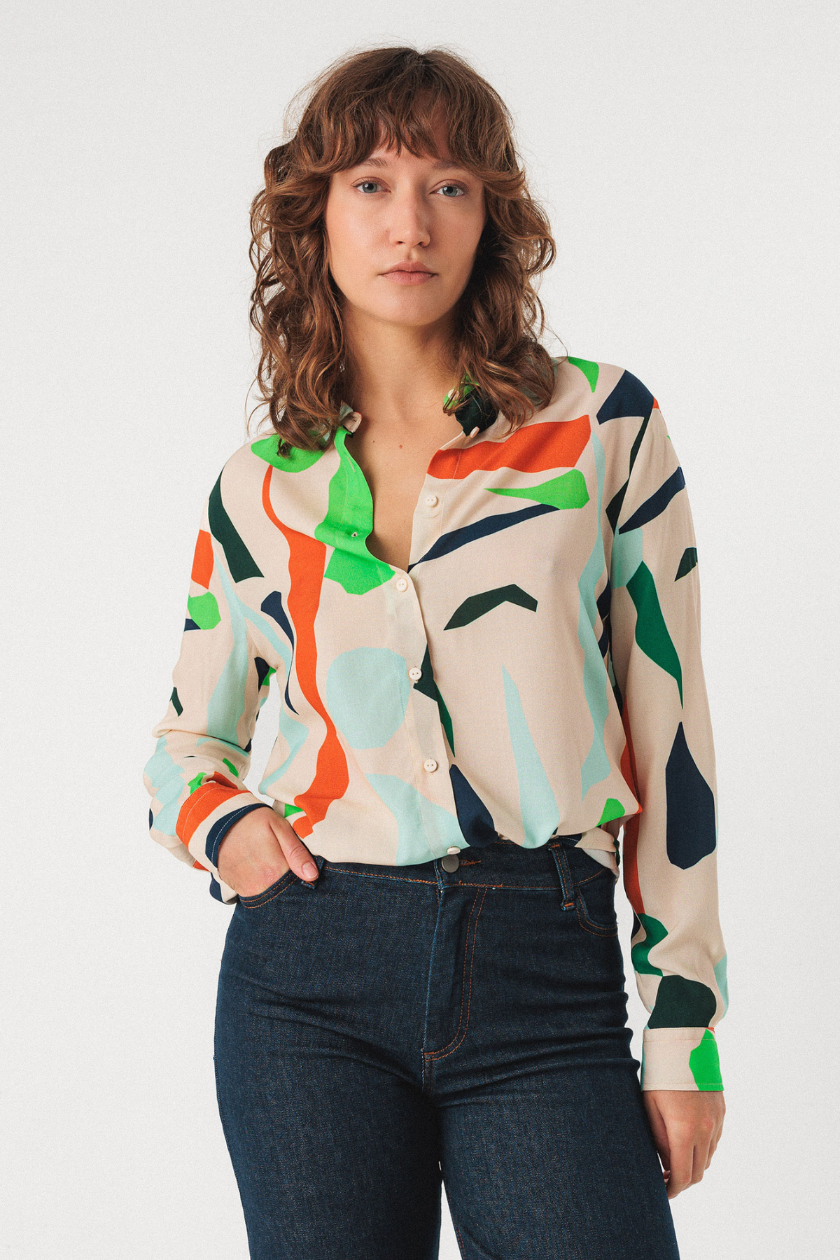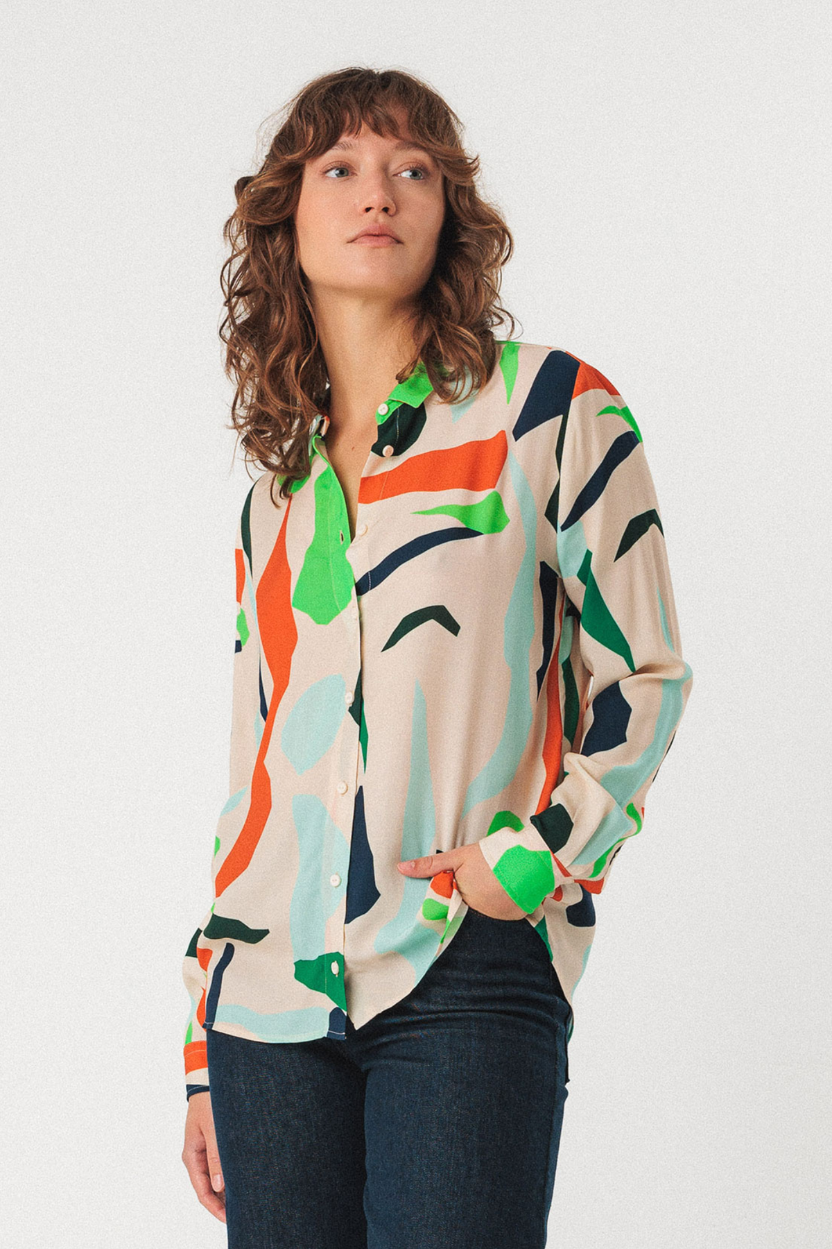 Leicht fließende Langarmbluse aus Viskose mit buntem grafischem Print. Mit Knopfleiste und klassischem Kragen versehen. Die Ärmel werden an den Enden ebenfalls mit einem Knopf verschlossen.