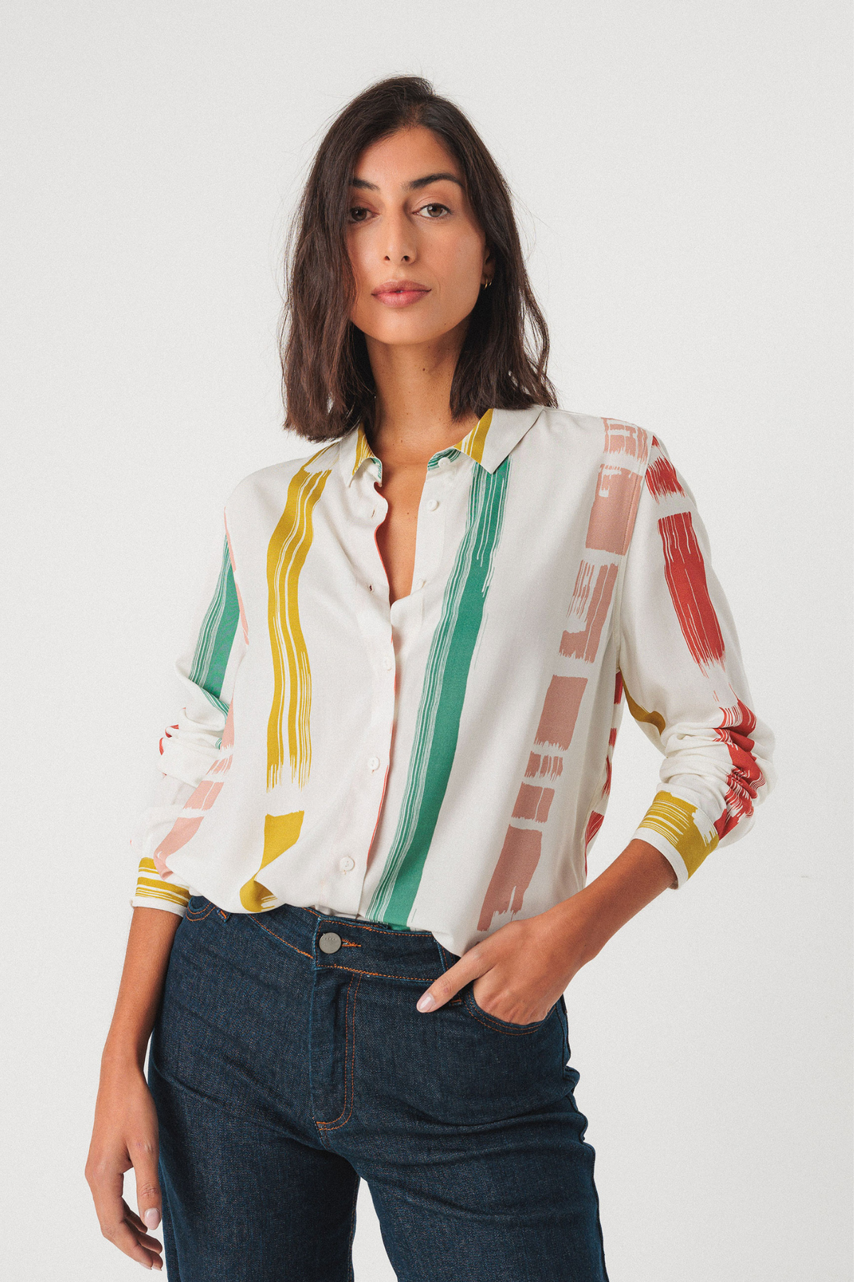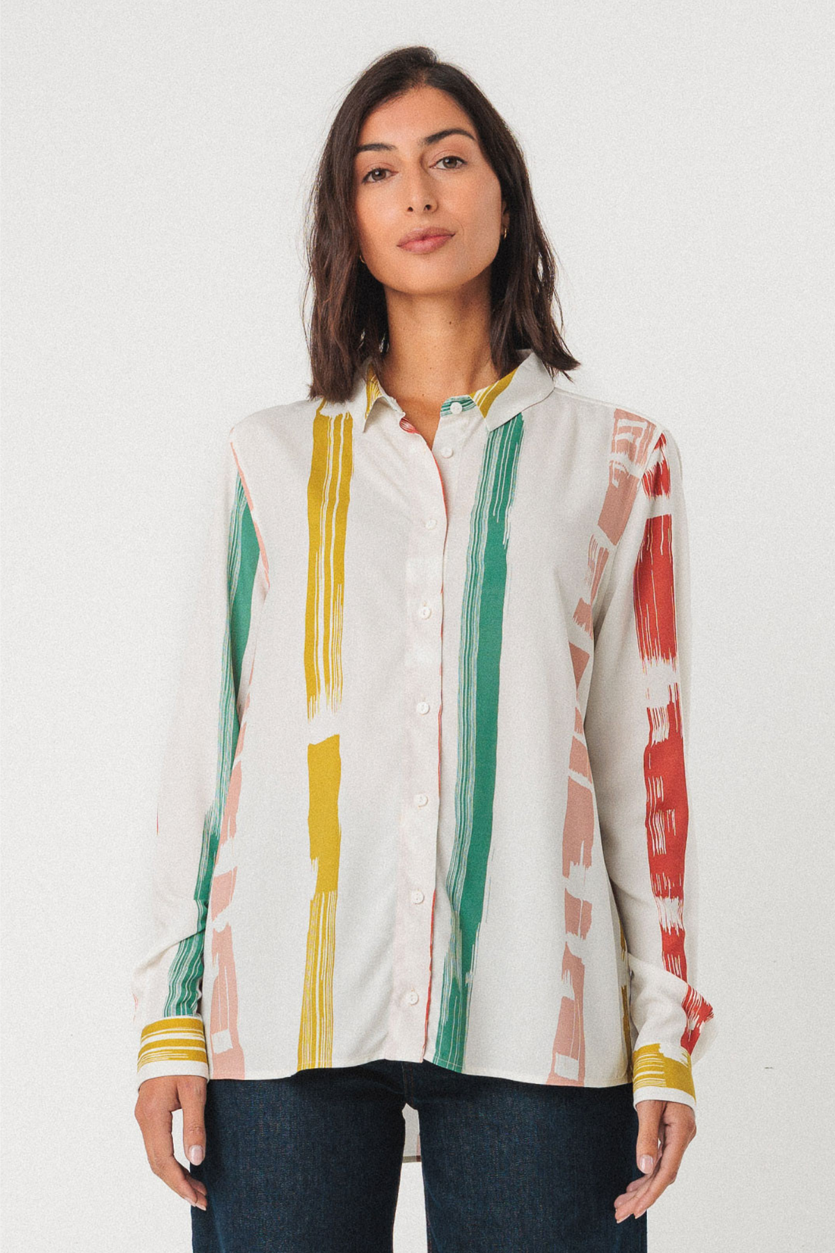 Leicht fließende Langarmbluse aus Viskose mit Farbstrichen in pastelligen Farben. Mit Knopfleiste und klassischem Kragen versehen. Die Ärmel werden an den Enden ebenfalls mit einem Knopf verschlossen.