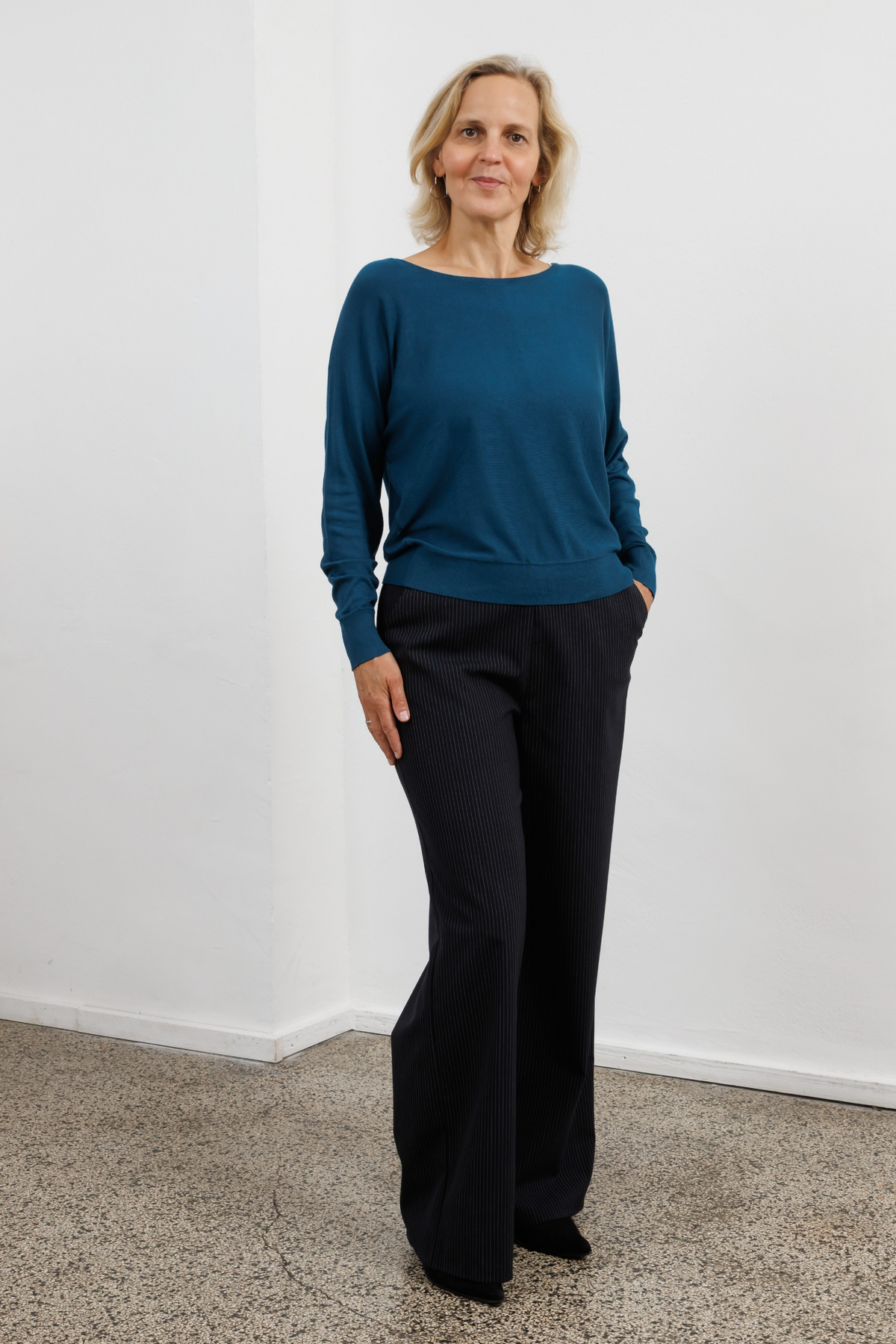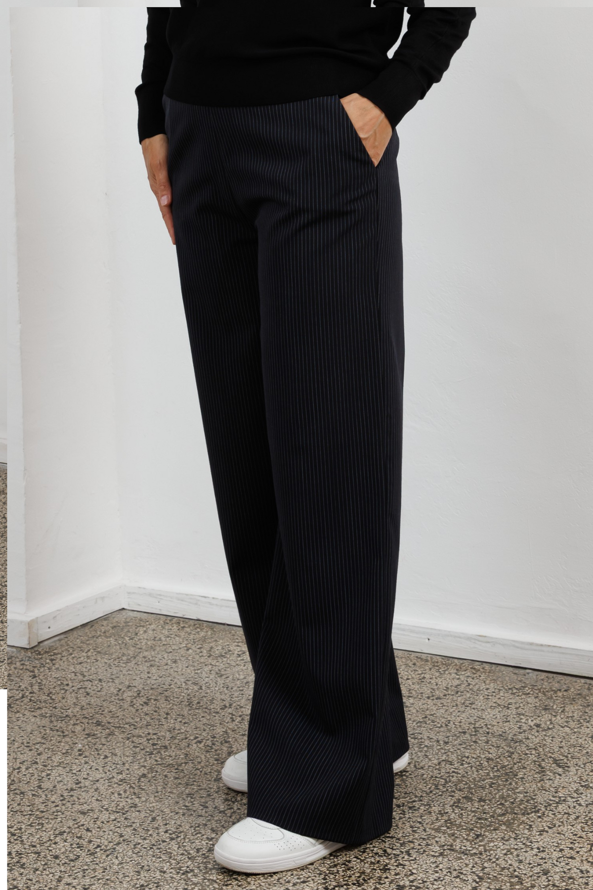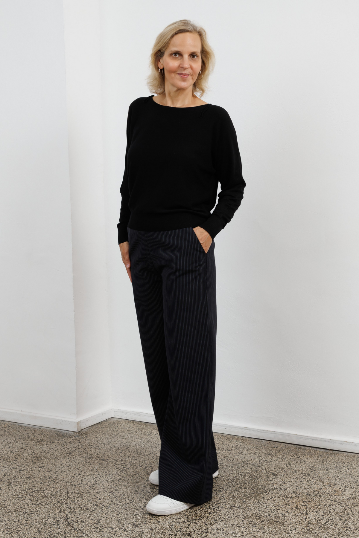 Schwarze Hose mit dezenten leichten petrolfarbenen Nadelstreifen. Die Hose ist tailliert geschnitten und besitzt hinten einen Reißverschluss.