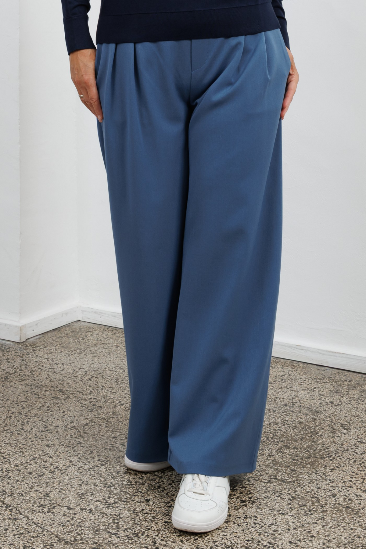 Hoch sitzende Hose mit leichten Bundfalten. Die Hose enthält einen leichten Elastananteil, hat seitliche Taschen und einen hinteren Gummizug.