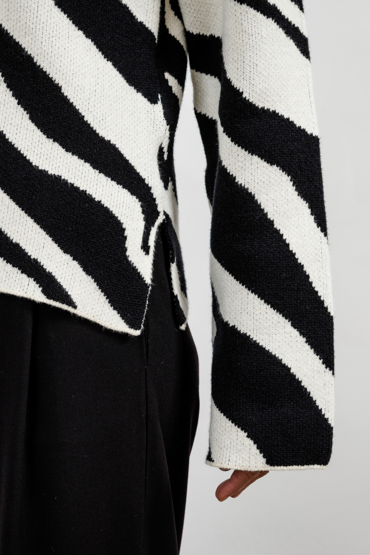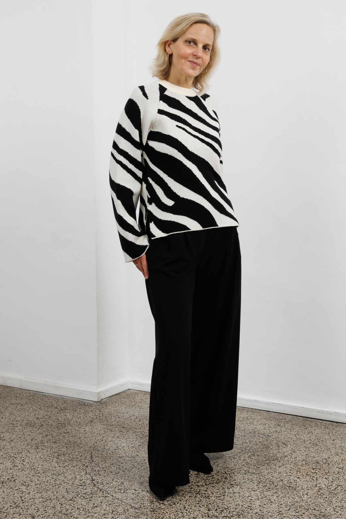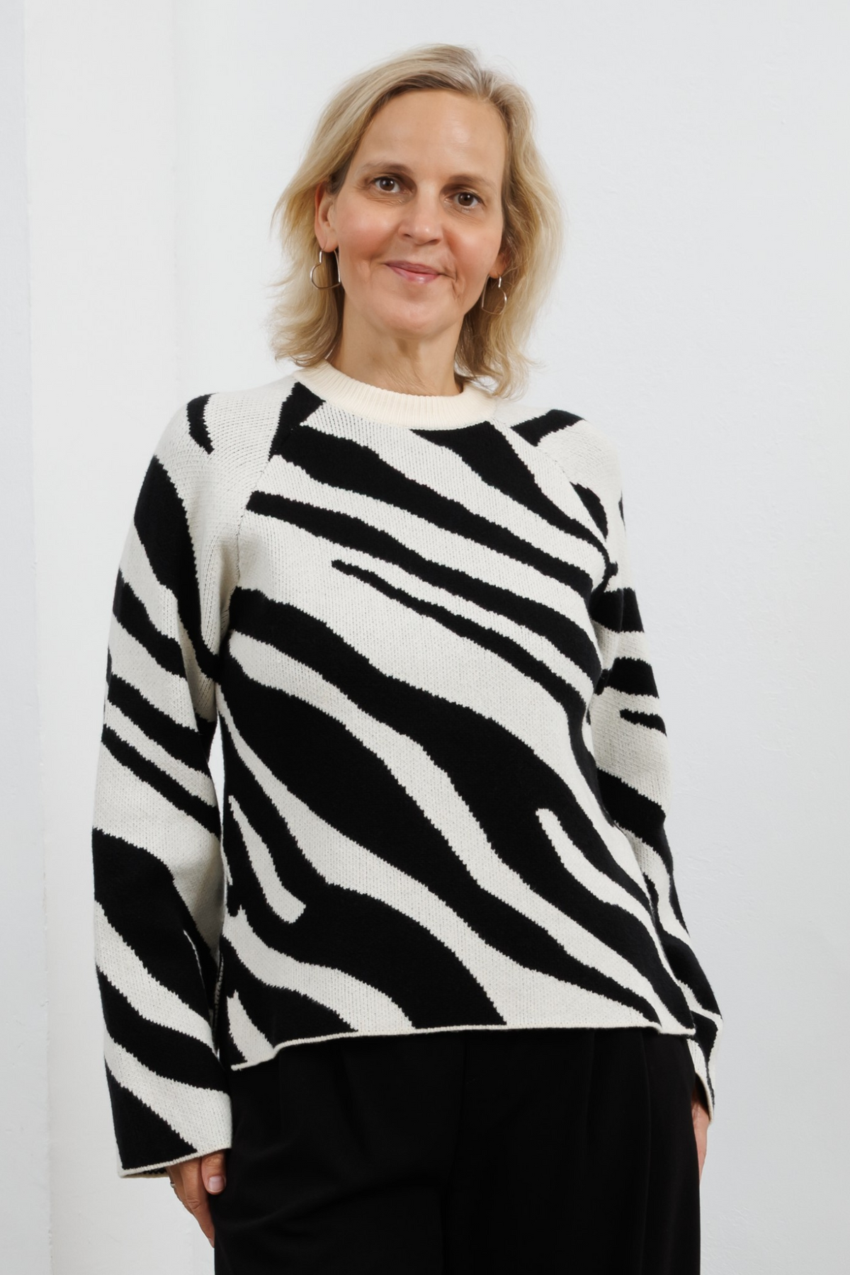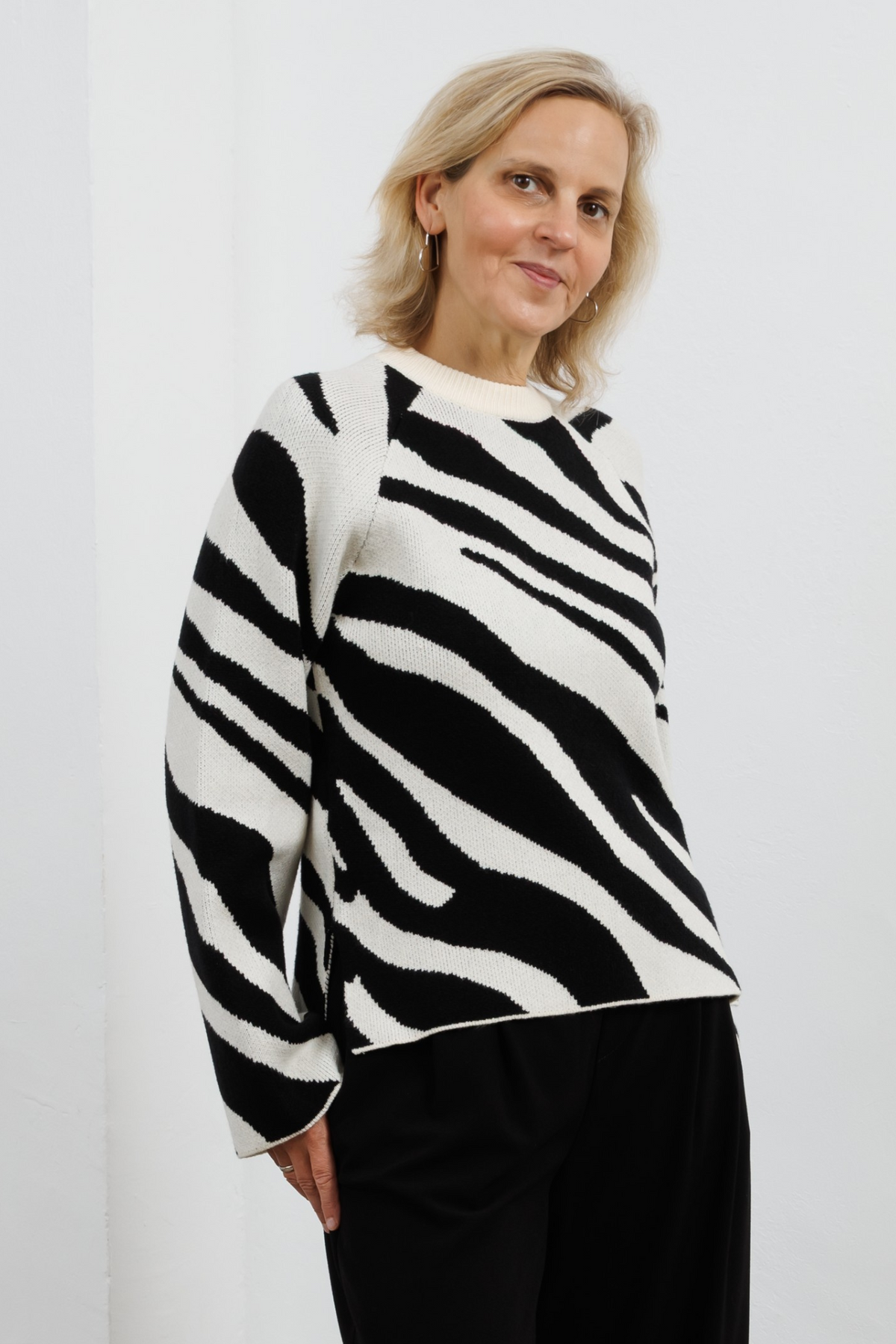 Dieser Pullover mit rotem Zebramuster ist ein echter Eyecatcher. Mit Rundhalsausschnitt, langen weiten Ärmeln und seitlichen Schlitzen am Bund. Einfach mega bequem!