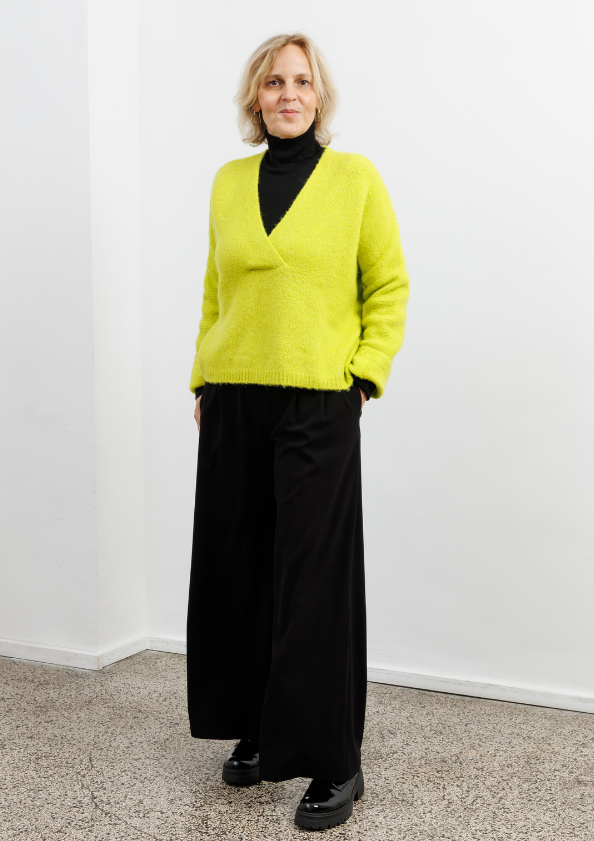 Tipp: Dieser Pullover passt von der Länge und dem Style gut zu hochsitzenden Röcken und Hosen. Er kann mit Blusen und Unterzieh-Pullovern gut kombiniert werden.