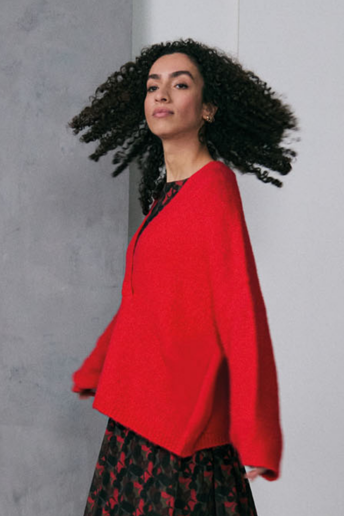Locker und kastig geschnittener Pullover mit abgesenkten Schulternähten und V-Ausschnitt aus einer warmen, leichten Wollmischung mit Alpaka für ein weiches Gefühl.
