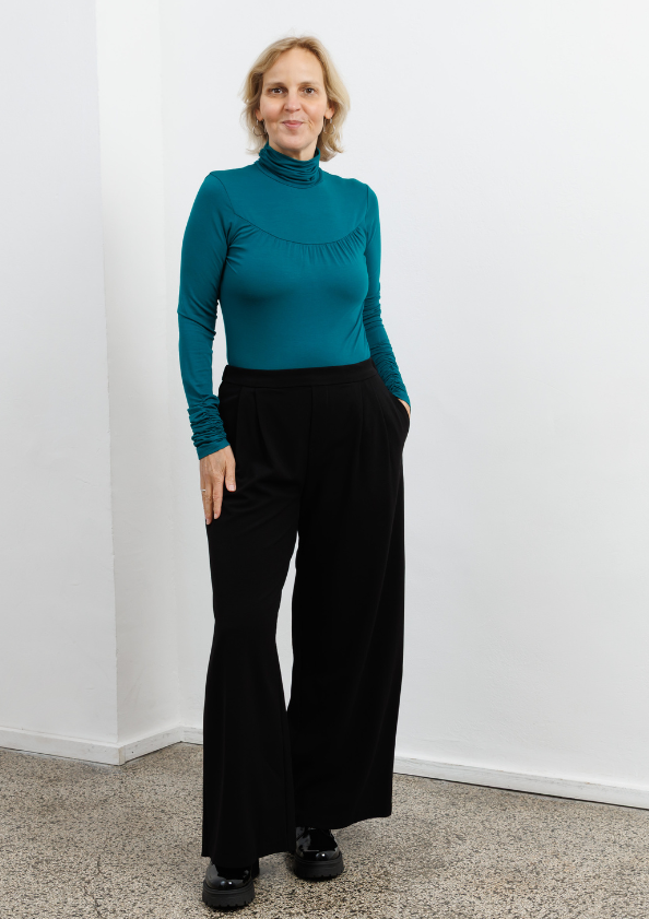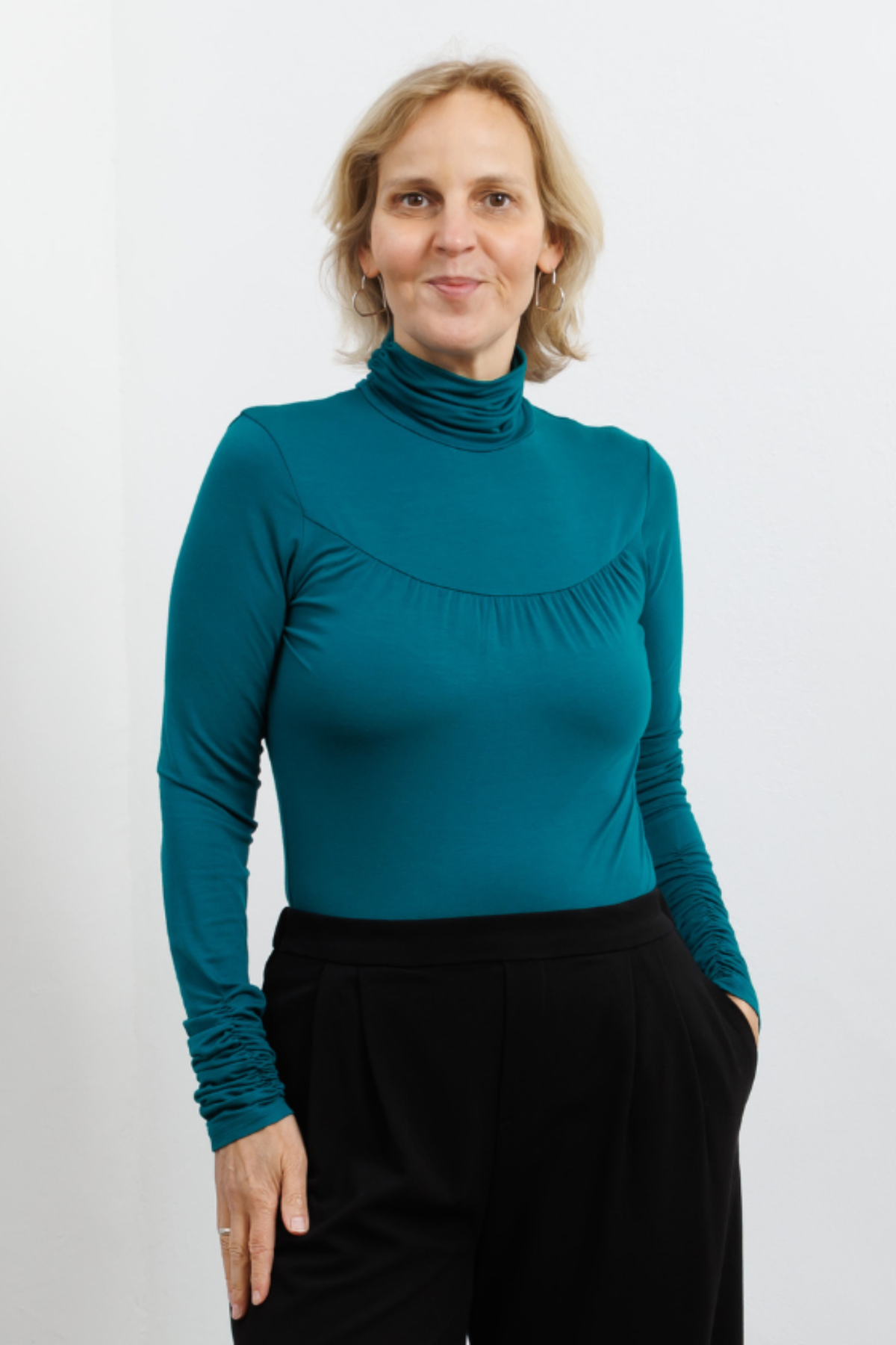 Ein Rollkragenshirt mit pfiffigen Details. Durch eine raffinierte Raffung an Kragen, Brustbereich und Ärmeln ist es ein echter Hingucker.  Es ist auch für Frauen mit längeren Armen geeignet. Man kann es auch wunderbar unter Jacken und Pullovern tragen.