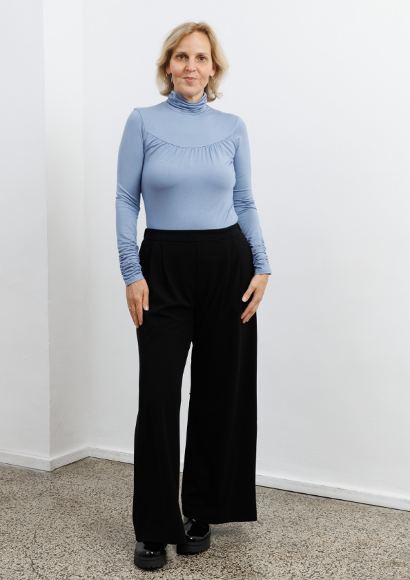 Ein Rollkragenshirt mit pfiffigen Details. Durch eine raffinierte Raffung an Kragen, Brustbereich und Ärmeln ist es ein echter Hingucker.  Es ist auch für Frauen mit längeren Armen geeignet. Man kann es auch wunderbar unter Jacken und Pullovern tragen.