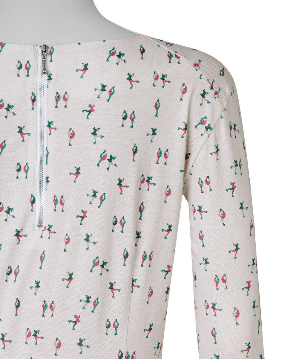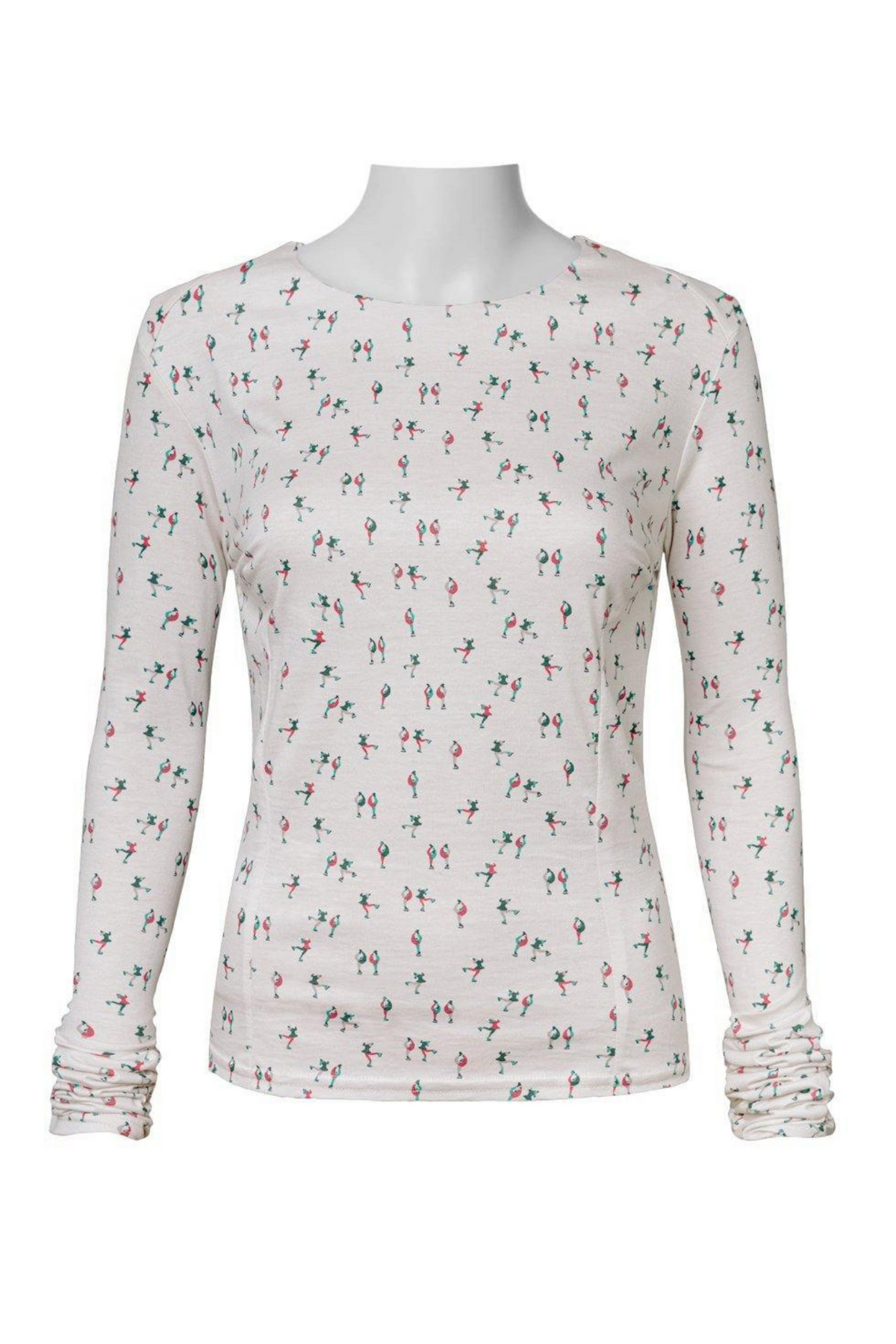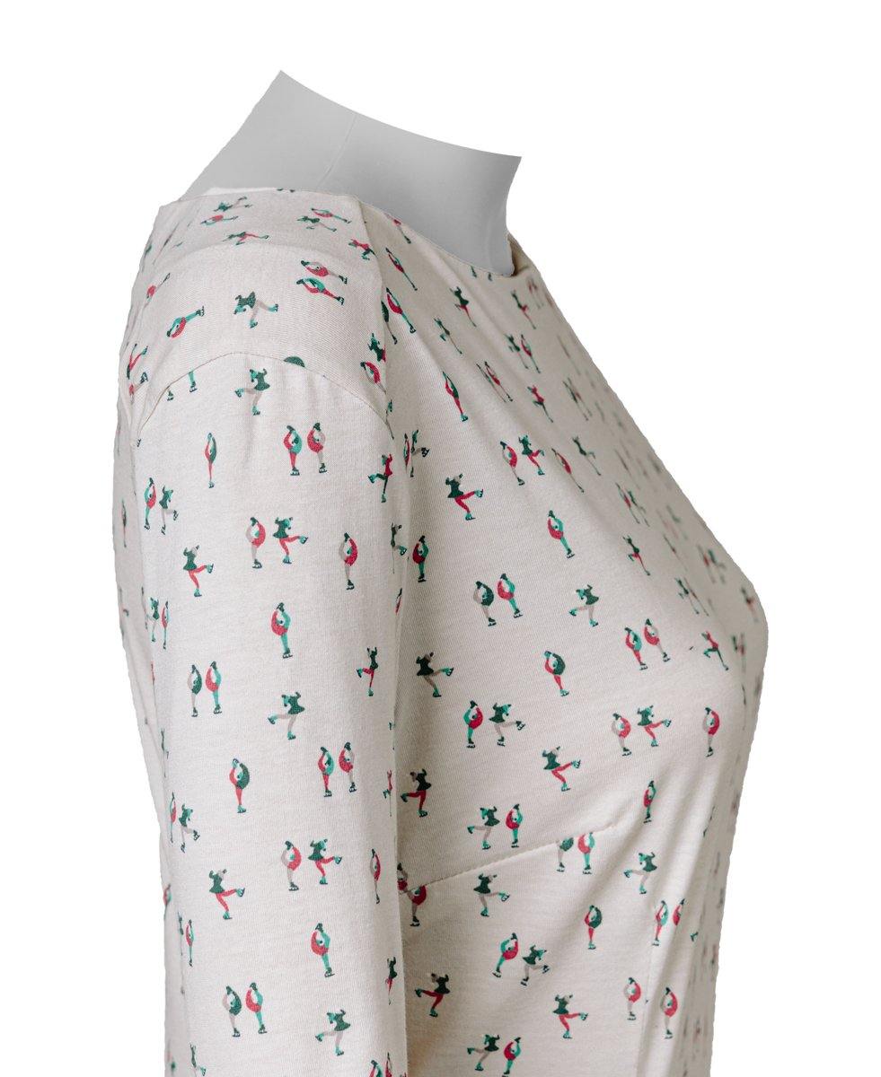 Cremefarbenes Rundhalsshirt mit rot-grünen Eiskunstlauffiguren.