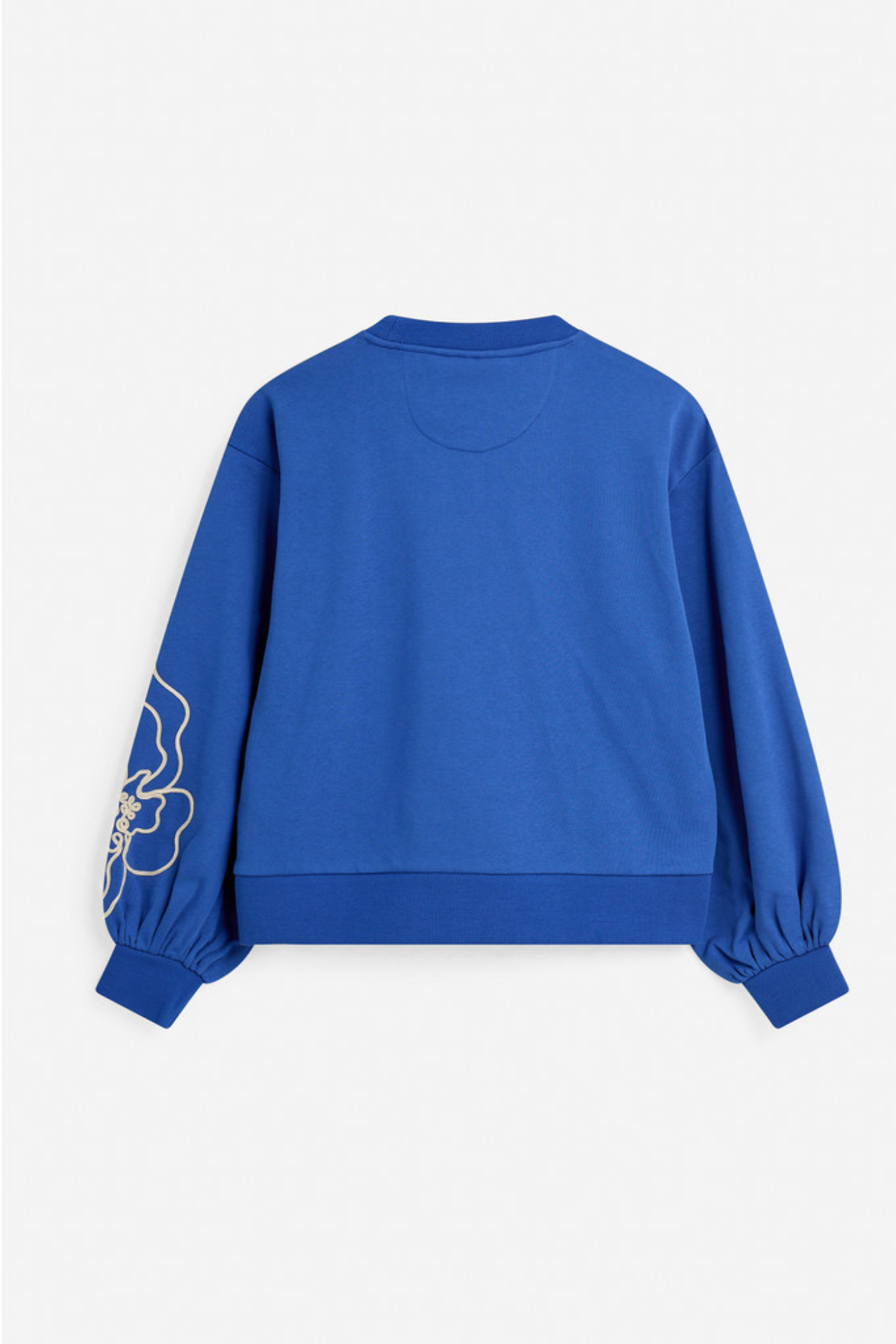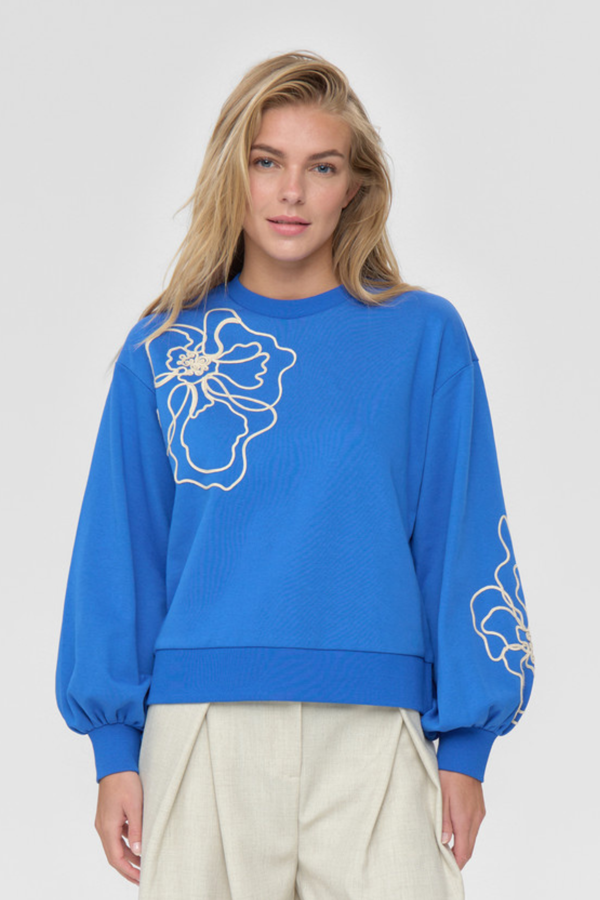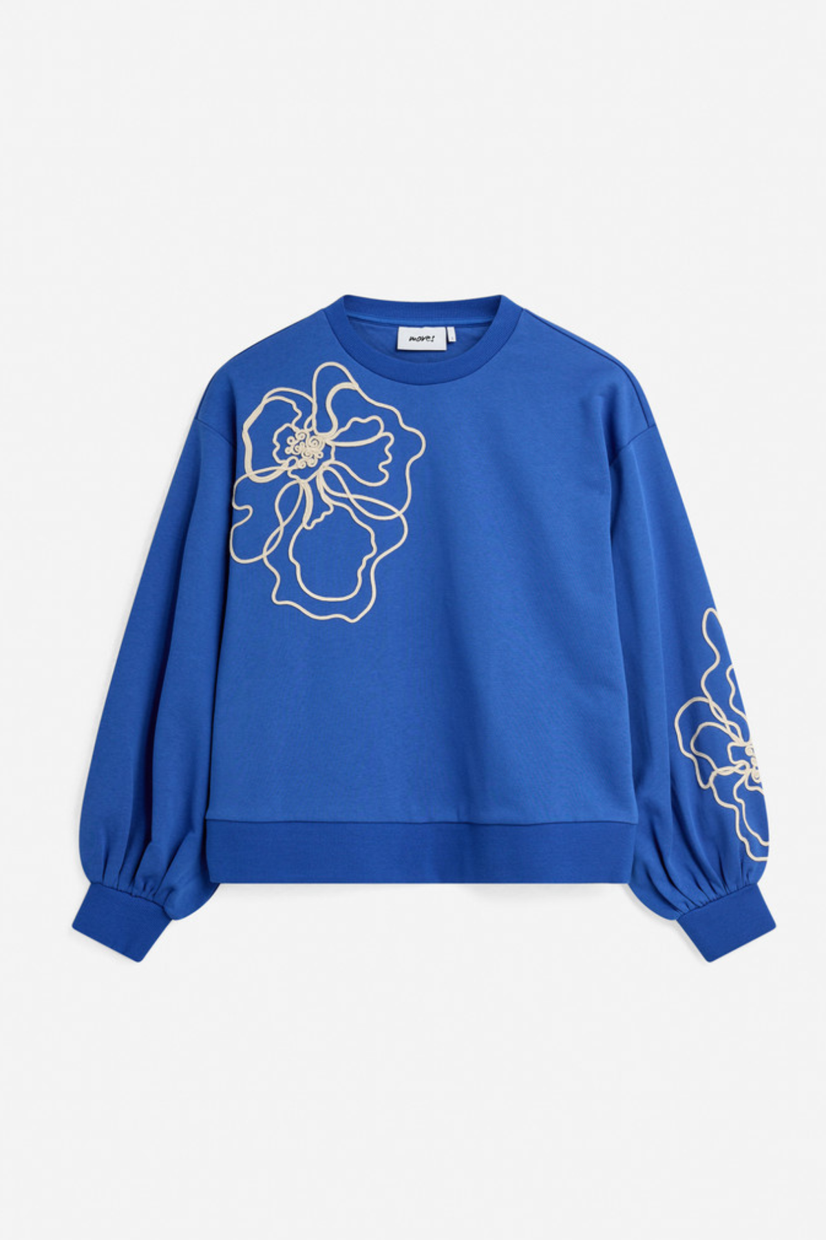 Weit sitzender Sweater mit floralen Bestickungen. Der Sweater fällt groß aus, so dass Größe S auch für M funktioniert, M für L, usw.